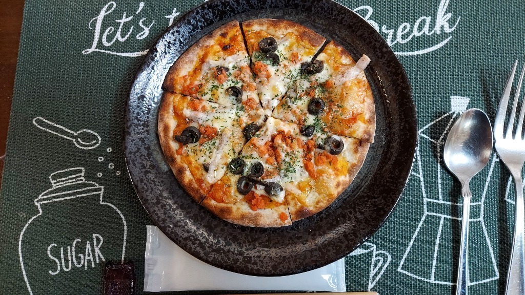 鮭フレークと特性パンチェッタのトマトソースピザと